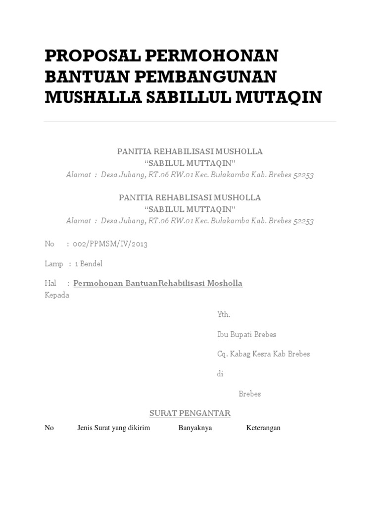 Proposal selengkapnya dapat didownload di sini. Anak sekolah seperti pelajar, mahasiswa, bahkan orang tua yang berprofesi di dunia bisnis atau di perusahaan pasti tidak asing dengan istilah proposal. Berikut ini adalah contoh proposal permohonan dana masjid atau musholla yang dapat sobat tiru untuk dapat dipergunakan sebagaimana mestinya. Proposal proyek pembangunan mushola al. Permohonan dana pembangunan mushola â€Å“nurul falahâ€� desa katonsari rt;02 rw;02 kecamatan demak kabupatenâ.