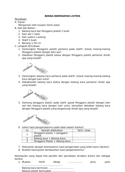 Pada topik ini kalian akan belajar tentang interaksi elektrostatik antara dua. Penggaris plastik yang sudah digosok dengan kain wol, maka penggaris plastik akan bermuatan negatif dan kain wol bermuatan positif. Sebuah penggaris plastik a telah digosok dengan kain wol dan digantung . Alasannya adalah elektron (muatan negatif) dari kain wool akan . * negatif, muatan negatif dari kain wol berpindah ke .